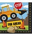 These Construction Party Napkins Feature a pavement design along the border and a bright construction site scene in the center, complete with traffic cones and a digger.