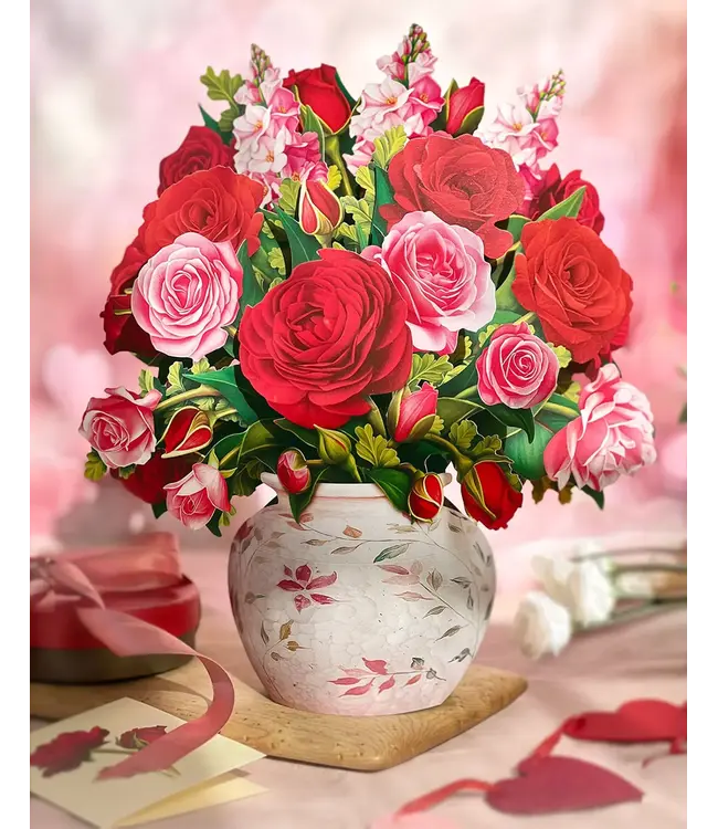 Poetic and romantic, luscious garden roses and snapdragons shimmer in shades of pink and red displayed in an ornate watercolor crackle vase. Read more.