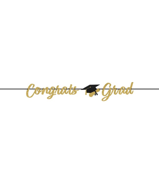 Celebrate your graduate's success with the Congrats Grad Gold Glitter Banner, featuring glittering lettering and graduation icons, perfect for party decor. Read more.