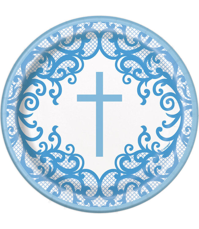 Enhance your party or special occasion with Fancy Blue Cross Dessert Plates by Unique Industries Inc. These plates are designed to add a touch of elegance and sophistication to your dessert table, making them perfect for any event, from birthdays to weddings. Each pack includes eight high-quality plates, ensuring you have enough for your guests.