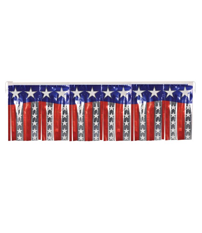 Celebrate patriotic holidays with the Beistle Stars & Stripes Metallic Fringe Banner. Measuring 4 feet wide, this banner is perfect for enhancing your event decor with a shimmering, festive touch.