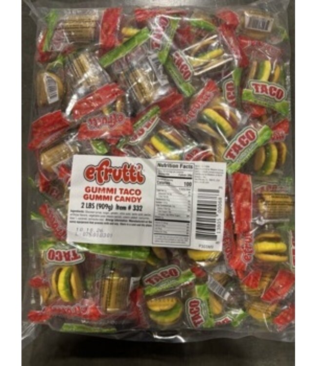 Indulge in a playful treat with eFrutti's 2lbs Gummy Candy Tacos, perfect for candy enthusiasts of all ages. Each taco-shaped gummy delivers a burst of fruity flavors, making it a fun addition to party favor bags or a unique snack for any occasion.