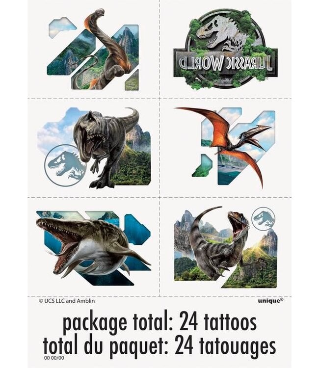 Transform any event into a prehistoric adventure with the Jurassic World 4 Tattoos - 24 Count by UNIQUE INDUSTRIES INC. These vibrant tattoos feature iconic dinosaurs from the beloved Jurassic World franchise, perfect for party favors, classroom rewards, or just for fun.