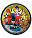 These round paper plates feature The Flash, Batman, Superman, and Aquaman on a classic comic book background. Lunch and snacks are exciting when served on these convenient disposable party plates.