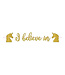 Features a gold glitter banner with the message "Believe" and unicorn cutouts.
