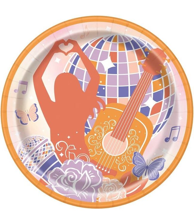 Enhance your party with the Pop Star Era 6.75in Dessert Plates by UNIQUE INDUSTRIES INC. These plates are perfect for serving desserts and snacks at any pop star-themed event, making cleanup a breeze while adding a touch of glam to your celebration. Designed to capture the essence of a pop star era, they are both functional and fashionable.