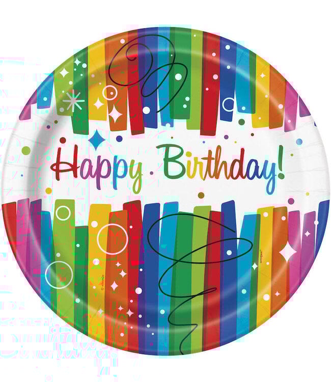 Elevate your next birthday party with the Rainbow Ribbons Birthday Dinner Plate set by UNIQUE INDUSTRIES INC. These plates are perfect for serving meals and desserts, making clean-up a breeze while adding a festive touch to your table setting.