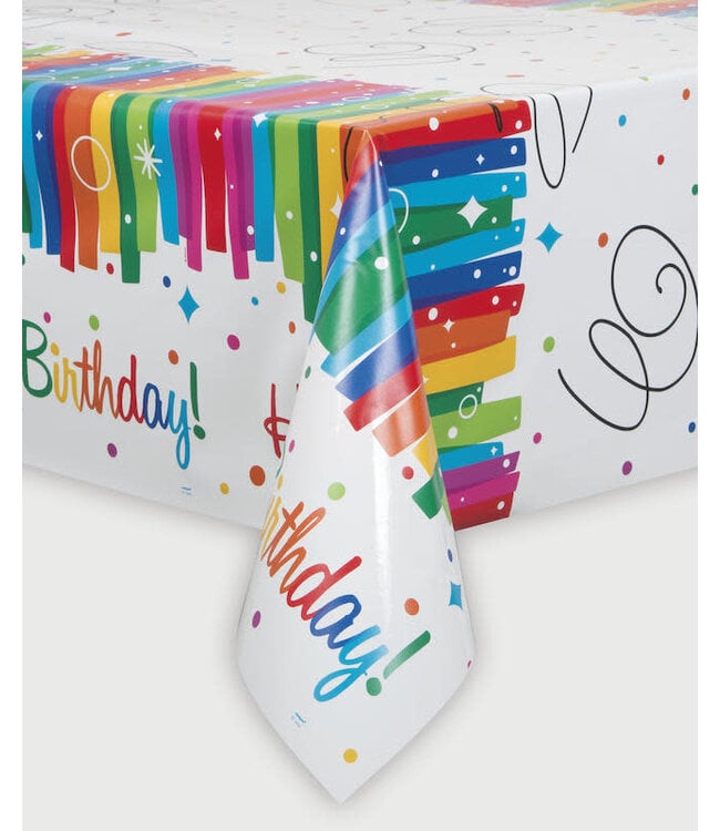Elevate your birthday party decor with the Rainbow Ribbons Birthday Table Cover by UNIQUE INDUSTRIES INC, featuring a perfect 54in x 84in size for most tables. Read more.